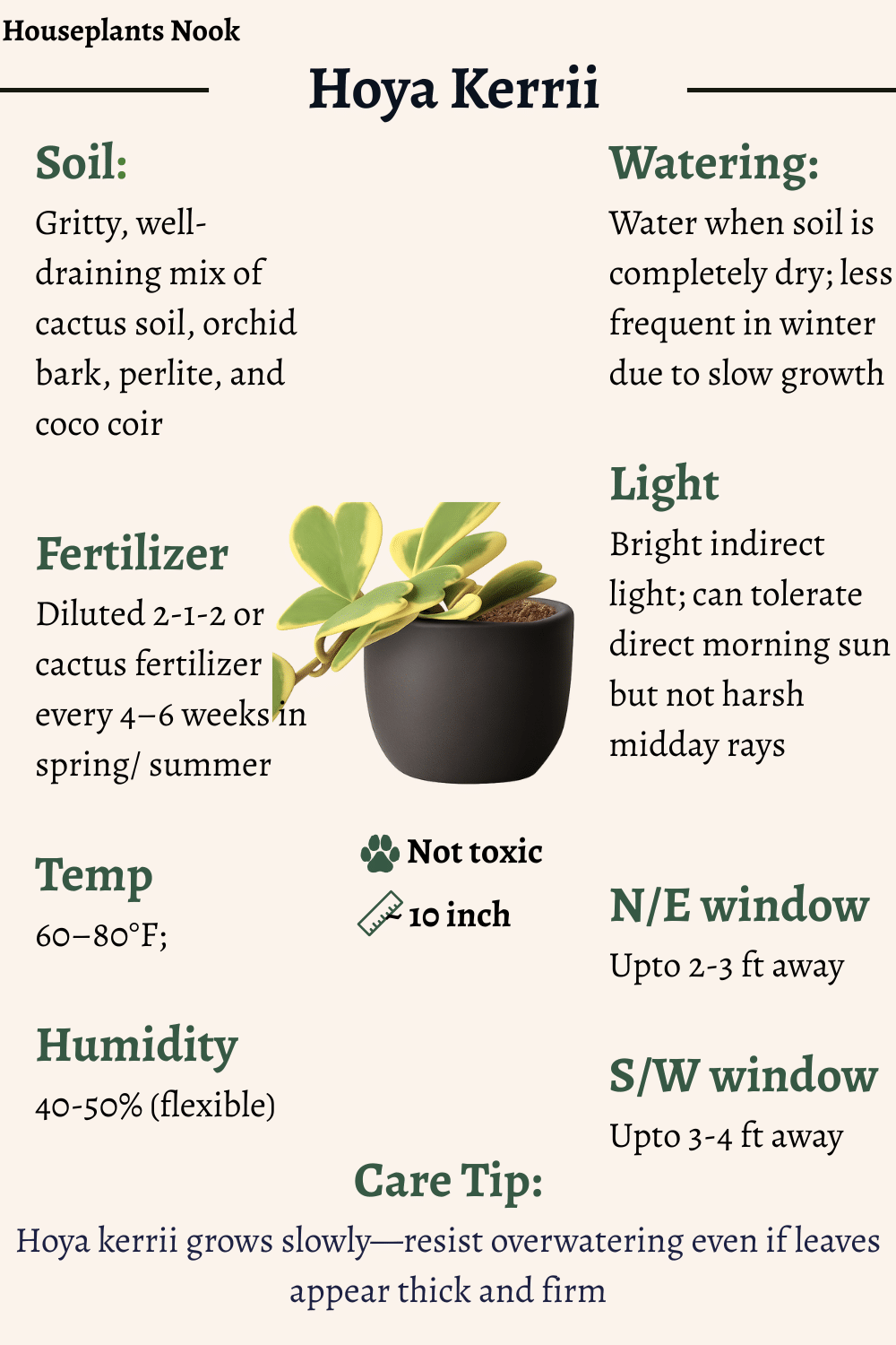 Hoya Kerrii kerrii needs fast-draining, airy soil that mimics its epiphytic jungle roots. We have in the past used 40% cactus mix, 30% orchid bark, 20% perlite, and 10% compost for nutrients without holding excess water.