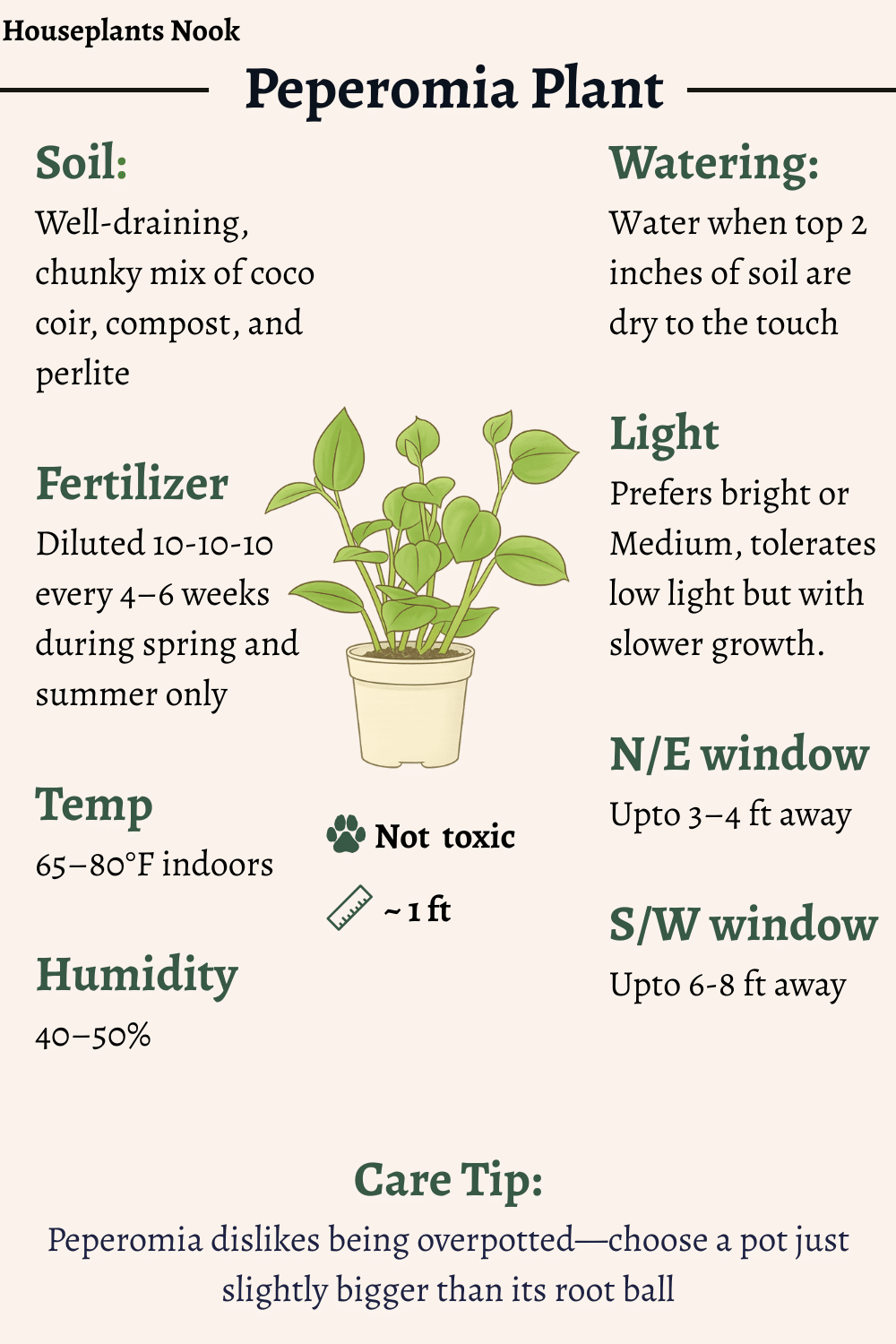 Peperomias like 65–80°F. They dislike cold drafts and dips below 60°F. We keep them away from open windows and elevate them off cold surfaces in winter.
